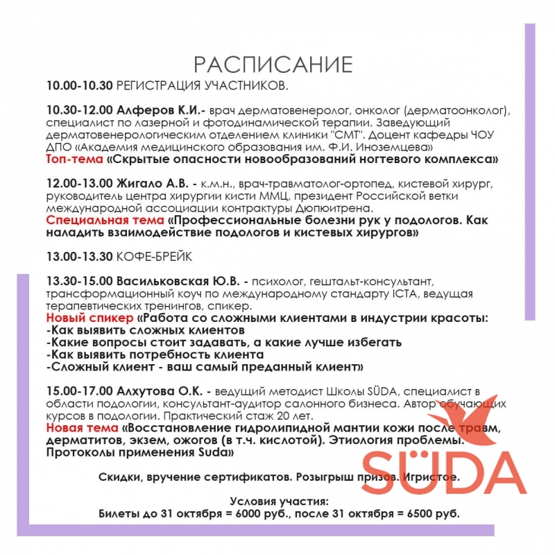 - Алхутова Ольга Константиновна (Москва) - Ведущий методист Школы SÜDA, специалист в области подологии, консультант-аудитор салонного бизнеса. Автор обучающих курсов в подологии. Практический стаж 20 лет
